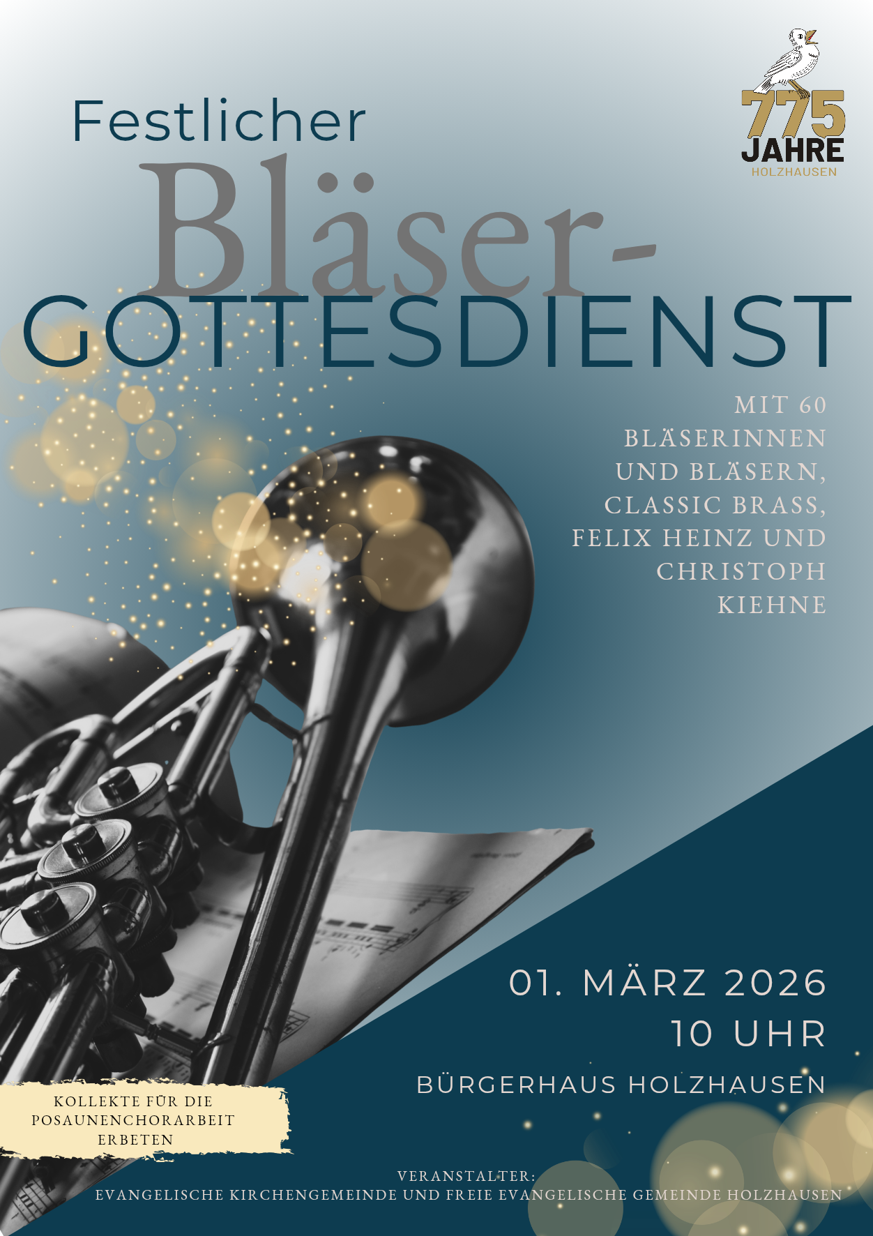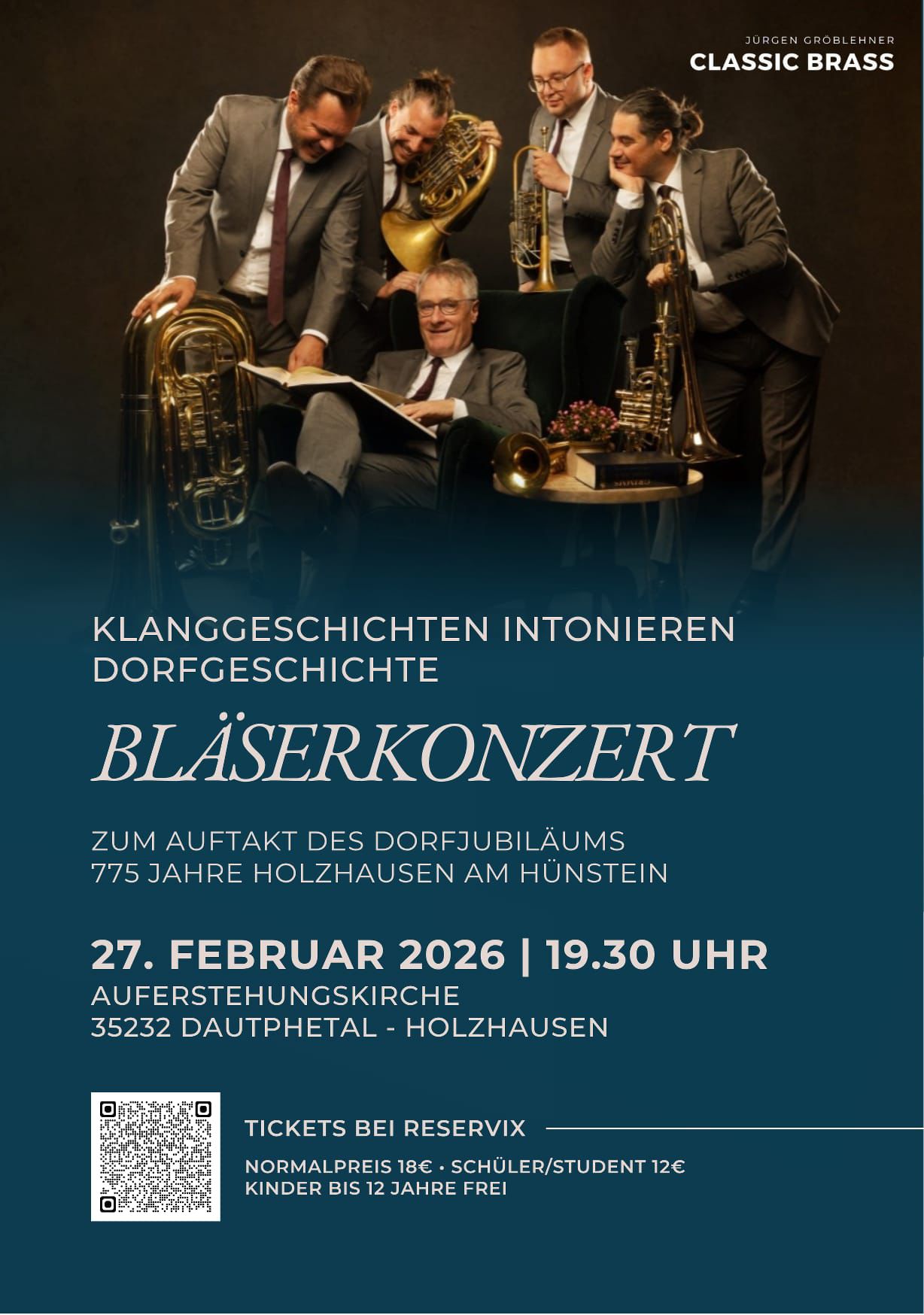 Bläserkonzert zum Auftakt des Jubiläums „775 Jahre Holzhausen am Hünstein“ Mit einem Konzert des international bekannten und renommierten Blechbläser-Ensembles CLASSIC BRASS startet das Jubiläumsjahr der „Holzhäuser Vujelcher“. Die evangelische Kirchengemeinde Holzhausen und der CVJM-Posaunenchor Holzhausen-Herzhausen sowie die Freie evangelische Gemeinde Holzhausen und ihr Bläserchor laden über die Dorfgrenze hinweg alle Musikinteressierten herzlich zur Bläsermusik der Extraklasse ein. Ticketverkauf über das Ticket-Portal Reservix.